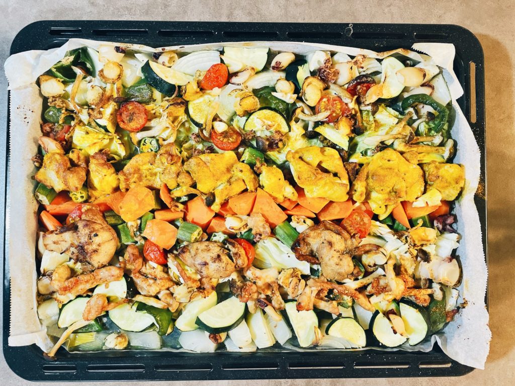 - 切った野菜にオリーブオイルをまぶし、塩とコショウで味を整えます。