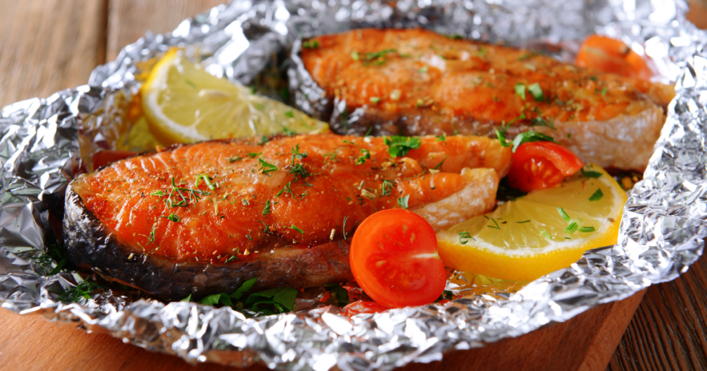 - アルミホイルに魚フィレと野菜をのせ、オリーブオイル、塩こしょうをかける。